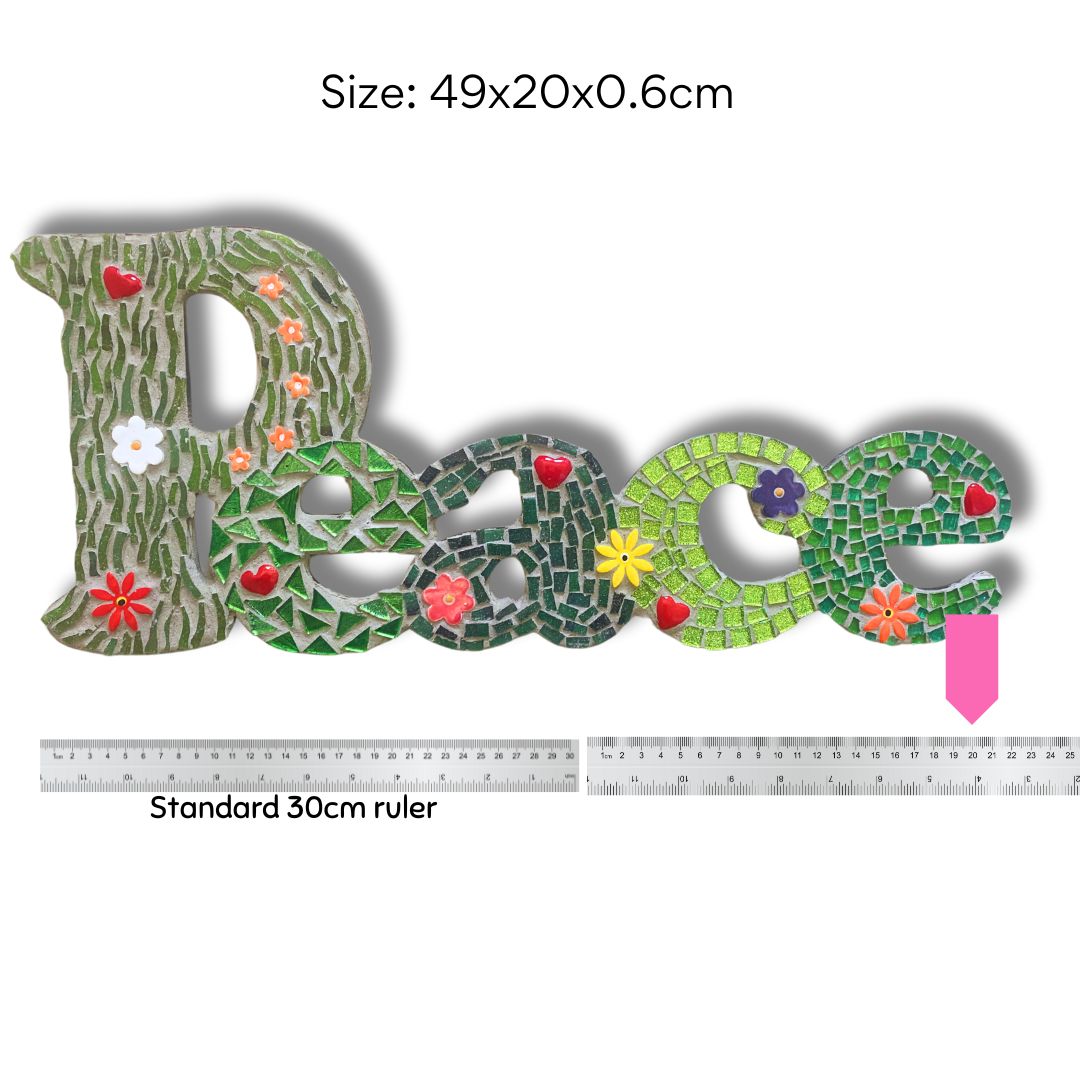 A wooden shape size 49x20x0.6cm with hanging hook, pre-cut mosaics, decorations, glue, grout, wooden spatula and instructions.