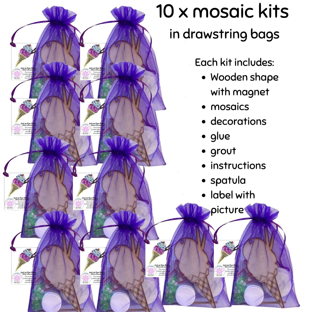 Great for teachers to use in classrooms, or if you want to do mosaics at a party. This pack contains 10 mosaic kits each in a ziplock bag with one set of instructions, one large tub of glue and one large tub of grout.
