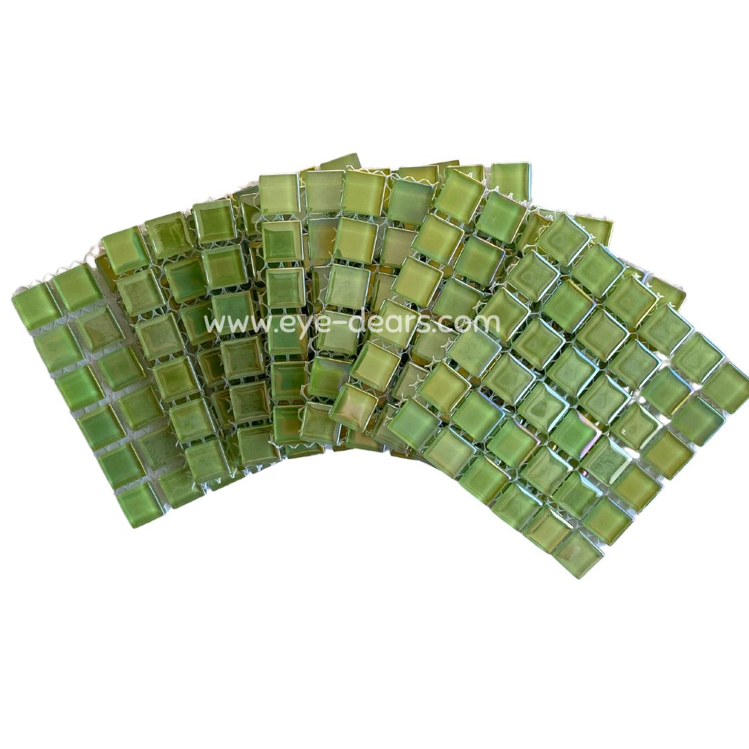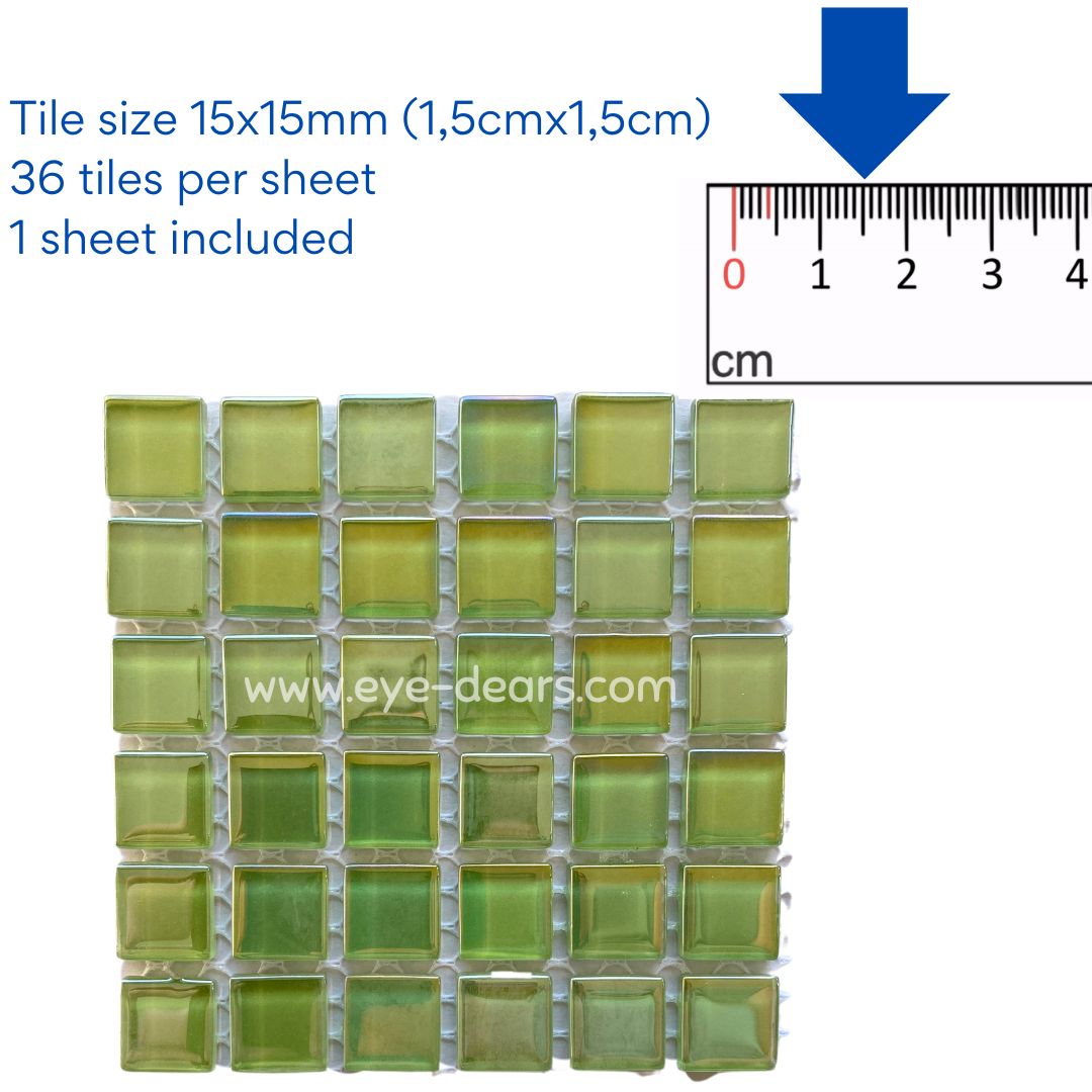 A beautiful array of 10 sheets of citrus green pearl mosaic tiles for crafting. These tiles can be used whole or cut into smaller pieces to make a stunning mosaic. They are a great addition to the Mosaic Starter Kit available from Eye-Dears as they provide even more variety of colours for the mosaic artist to be creative with!