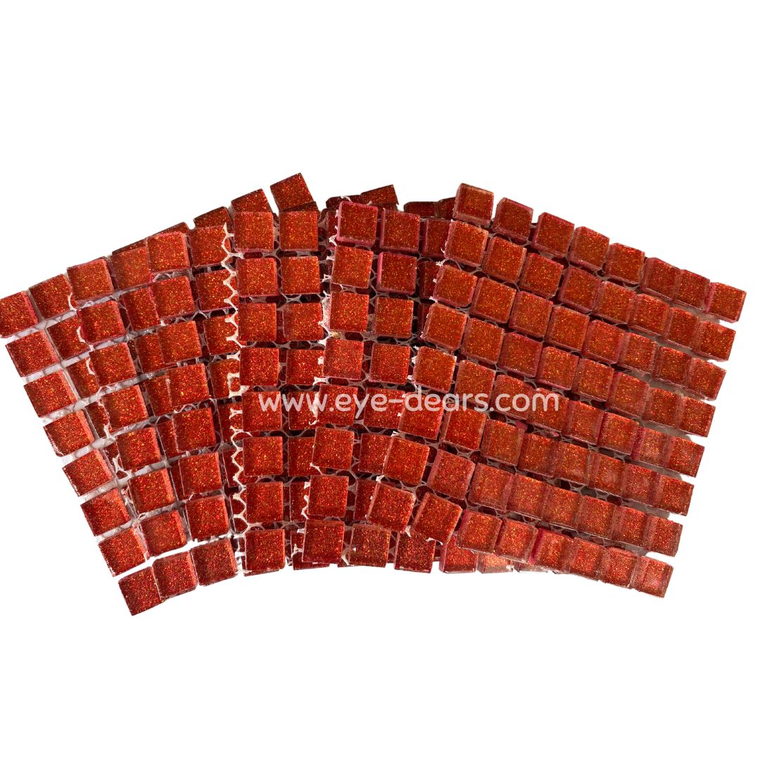 A beautiful array of 10 sheets of red glitter glass mosaic tiles for crafting. These tiles can be used whole or cut into smaller pieces to make a stunning mosaic. They are a great addition to the Mosaic Starter Kit available from Eye-Dears as they provide even more variety of colours for the mosaic artist to be creative with!
