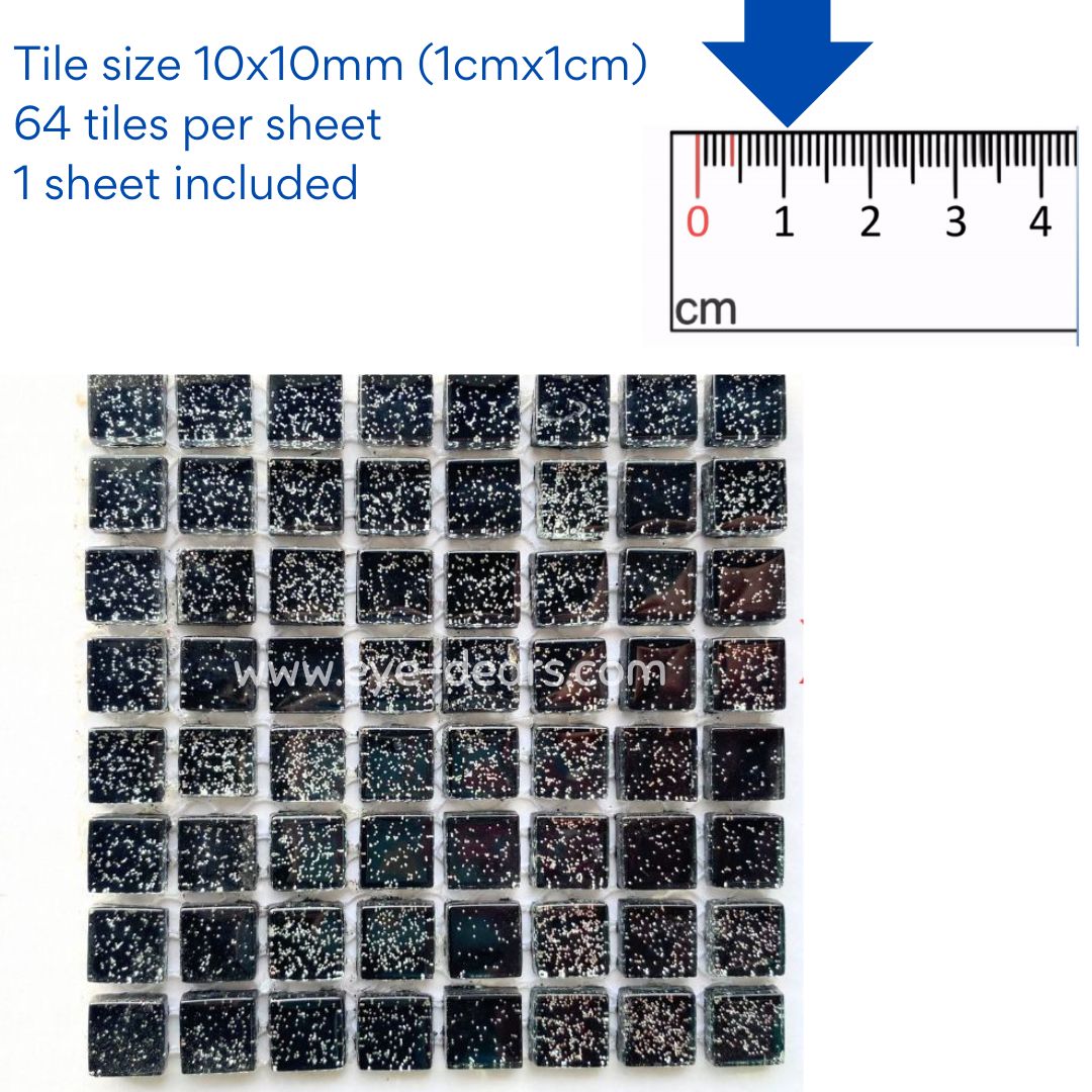 1 sheet of black glitter crystal glass mosaic tiles for crafting. These tiles can be used whole or cut into smaller pieces to make a stunning mosaic. They are a great addition to the Mosaic Starter Kit available from Eye-Dears as they provide even more variety of colours for the mosaic artist to be creative with!