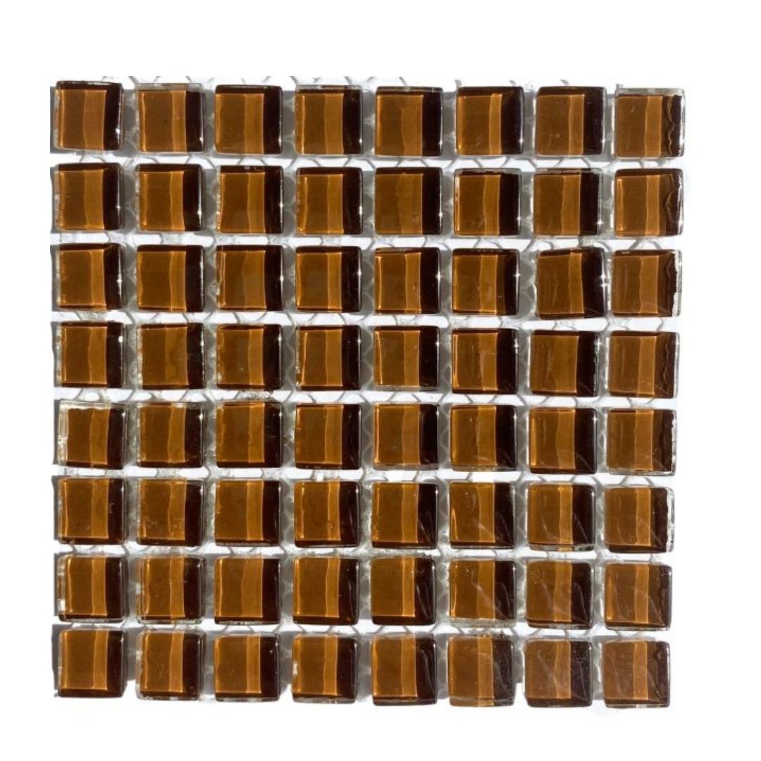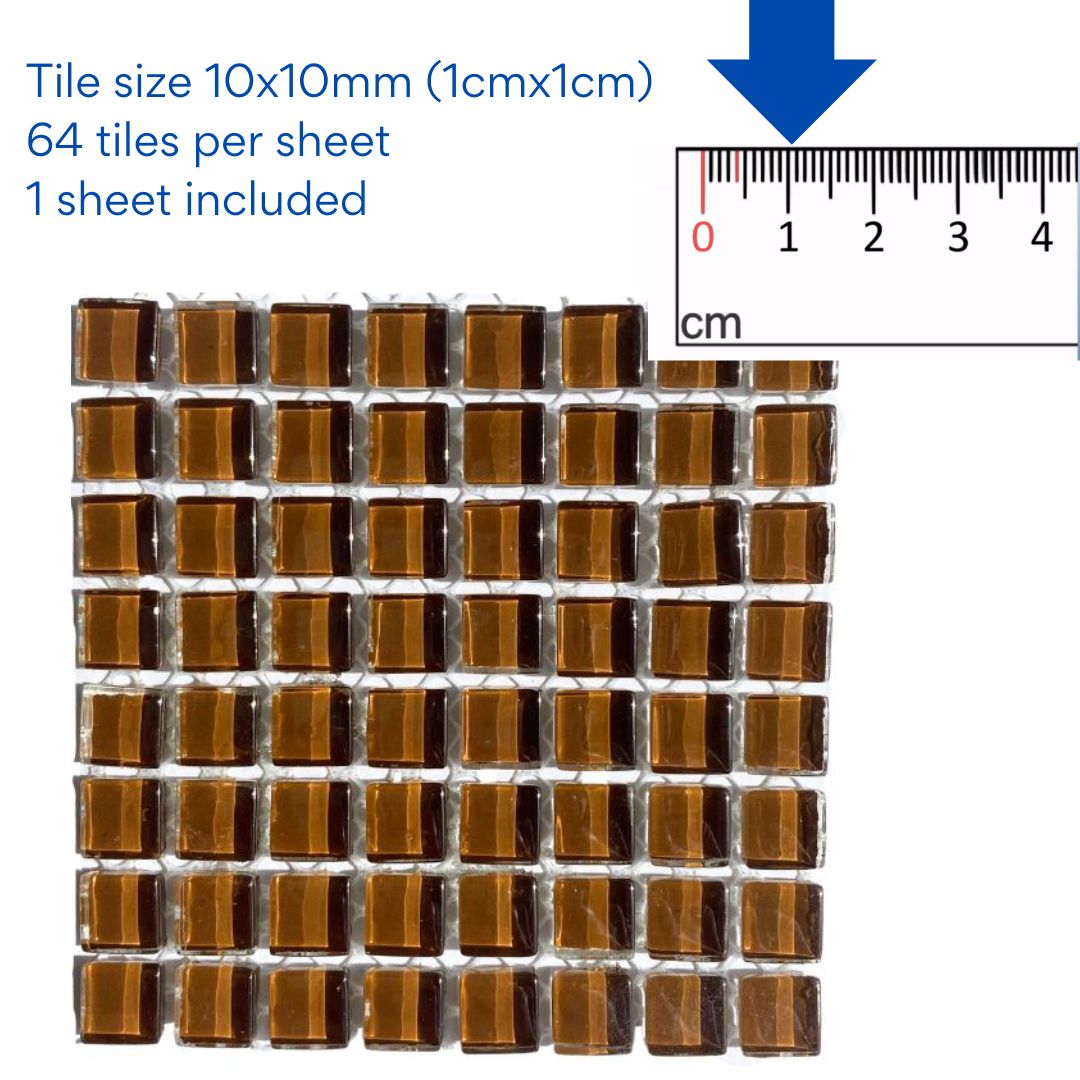 1 sheet of brown crystal glass mosaic tiles for crafting. These tiles can be used whole or cut into smaller pieces to make a stunning mosaic. They are a great addition to the Mosaic Starter Kit available from Eye-Dears as they provide even more variety of colours for the mosaic artist to be creative with!