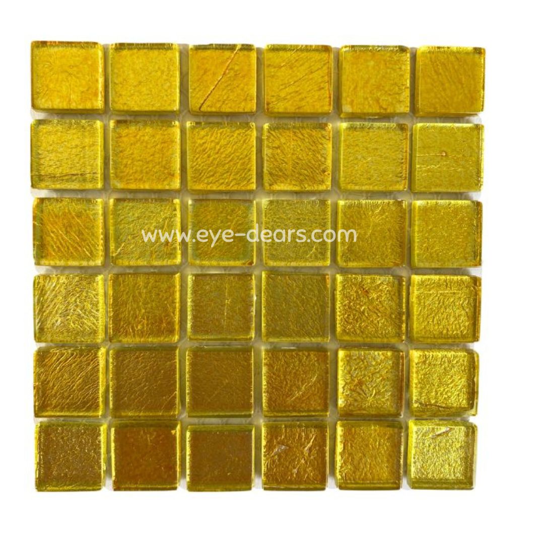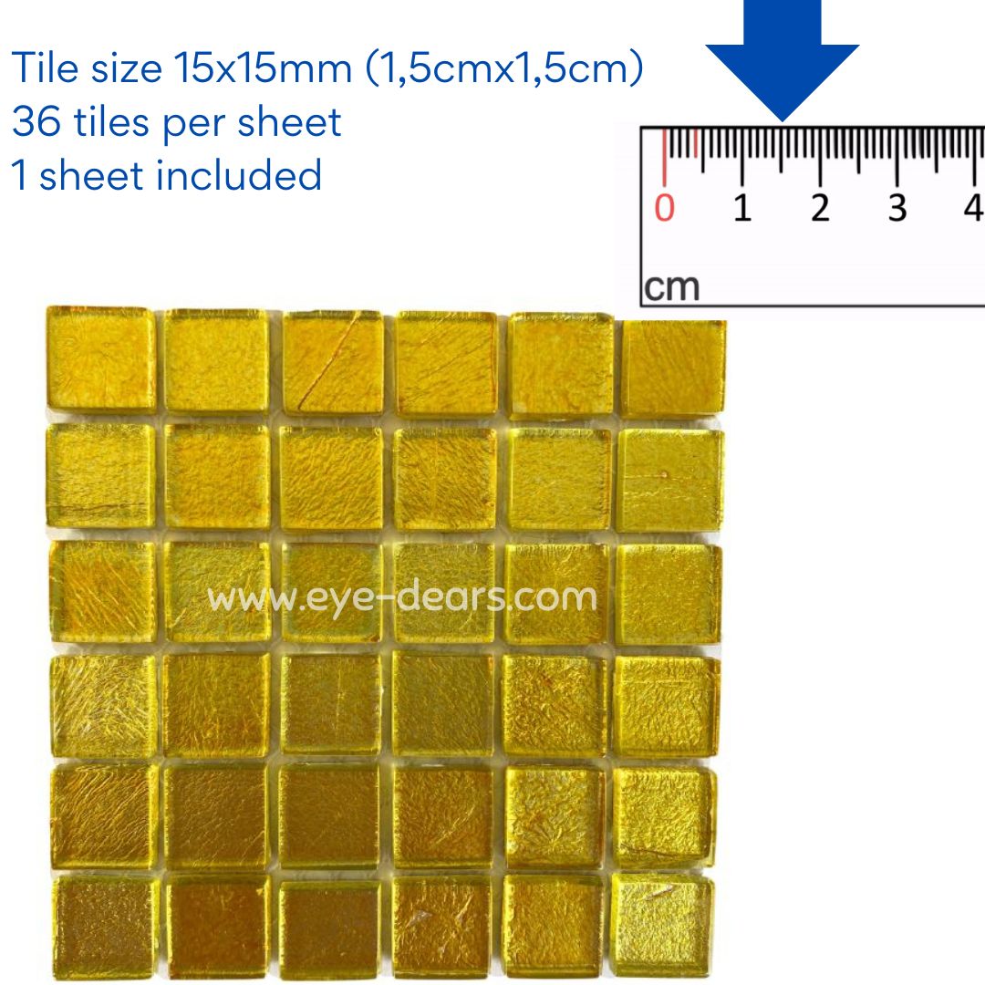 1 sheet of gold gold leaf mosaic tiles for crafting. These tiles can be used whole or cut into smaller pieces to make a stunning mosaic. They are a great addition to the Mosaic Starter Kit available from Eye-Dears as they provide even more variety of colours for the mosaic artist to be creative with!
