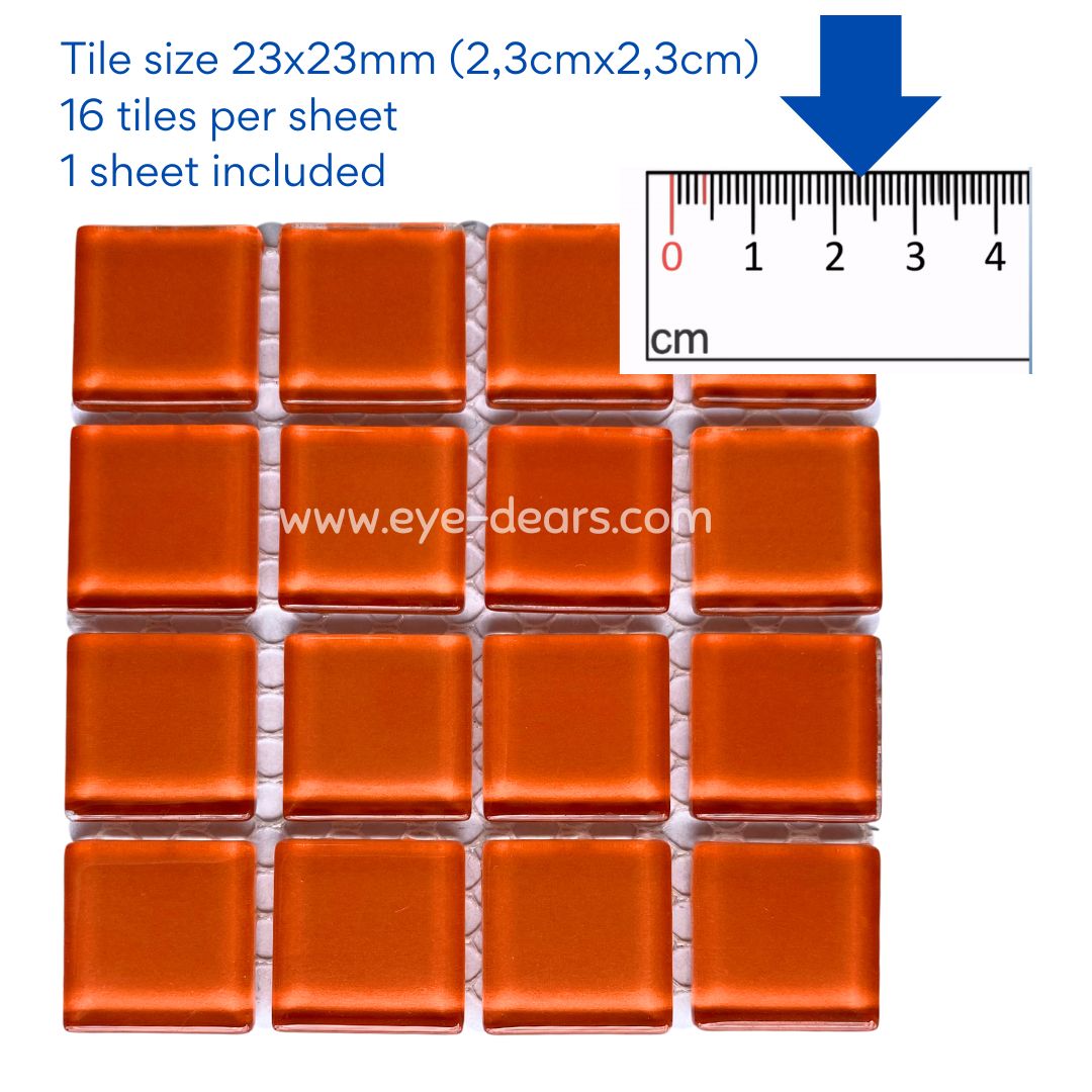 1 sheet of orange crystal glass mosaic tiles for crafting. These tiles can be used whole or cut into smaller pieces to make a stunning mosaic. They are a great addition to the Mosaic Starter Kit available from Eye-Dears as they provide even more variety of colours for the mosaic artist to be creative with!