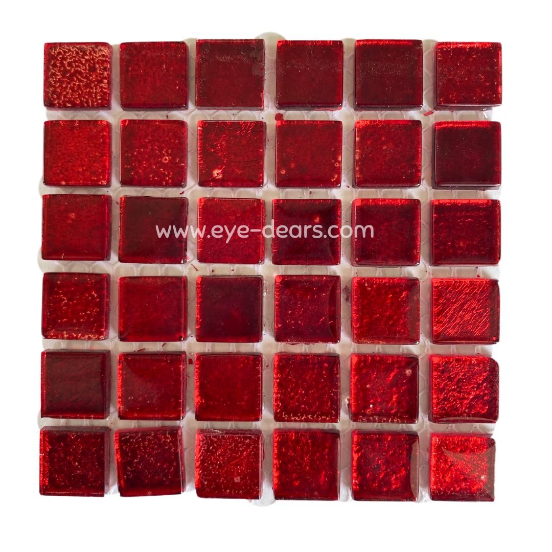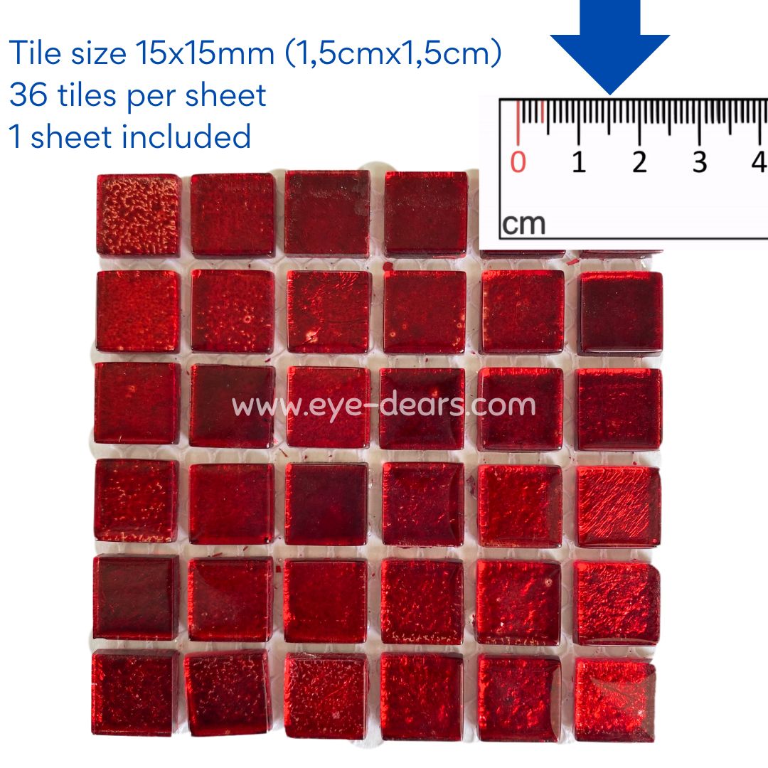 1 sheet of red gold leaf mosaic tiles for crafting. These tiles can be used whole or cut into smaller pieces to make a stunning mosaic. They are a great addition to the Mosaic Starter Kit available from Eye-Dears as they provide even more variety of colours for the mosaic artist to be creative with!